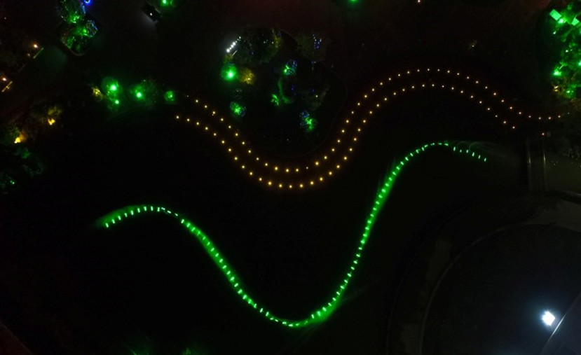 街區(qū)建筑物在房檐上設(shè)置RGB廣角小射燈,墻體中部配裝壁燈,頂部為LED洗墻燈,完整的勾勒出建筑物整體輪廓。建筑物瓦面的處理,僅采用硬條燈打亮屋脊的造型,壓低屋面整體亮度,明暗對比形成內(nèi)斂的神秘感。小投影燈在地面上投出羌族文化特色的圖案,小巧而精致,別有一番趣味