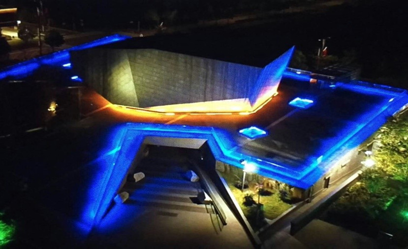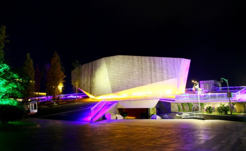幸福館以羌族所崇拜的白石為主題。護(hù)欄中嵌入的線條燈采用密集小功率燈珠和小角度透鏡,透過玻璃圍欄照射到下方不銹鋼底座上,線條燈反射出藍(lán)寶石的效果,達(dá)到見光不見燈的效果。同時在原有藍(lán)寶石造型的玻璃天臺中加入特定波長的藍(lán)色光源,讓出光效果更為接近寶石藍(lán),成為幸福館的一大亮點(diǎn)。