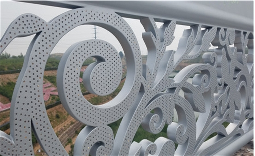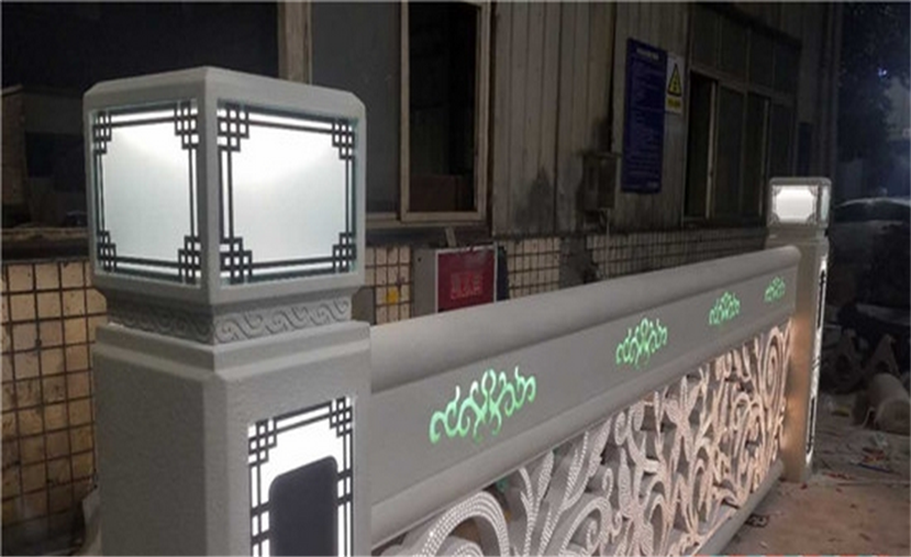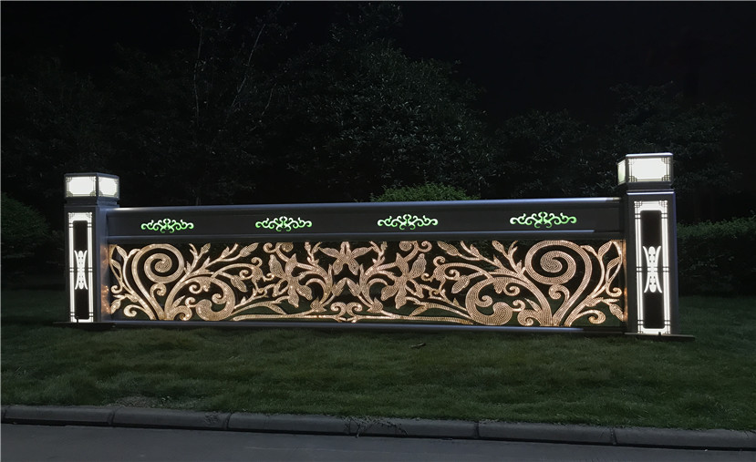 護(hù)欄體用不銹鋼材料雕刻、點(diǎn)焊成型。造型是鄂爾多斯市花馬蘭花。作品前后兩面激光切割三千個以上的小孔,作為出光像素點(diǎn),內(nèi)貼高目數(shù)不銹鋼防蟲網(wǎng),腔體內(nèi)根據(jù)造型曲線內(nèi)埋LED軟燈帶,并用專業(yè)卡扣固定。護(hù)欄上部橫向鏤空四朵馬蘭花紋飾,并用帶色透明樹脂填充。