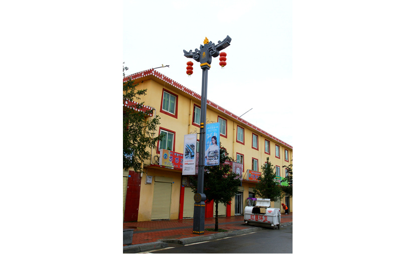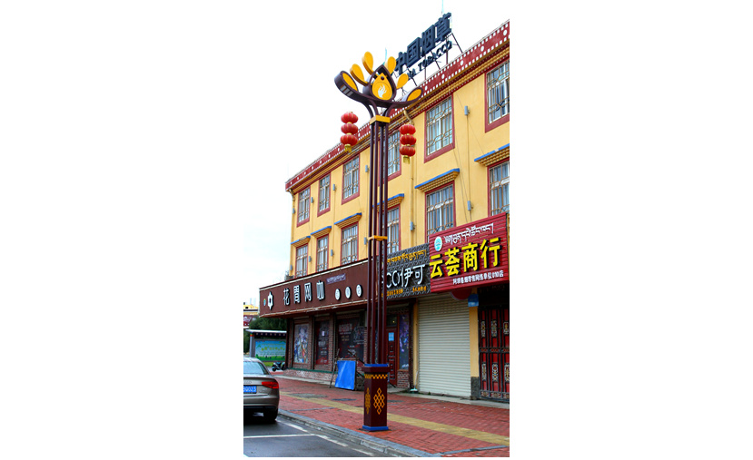 安裝在S209線的“犇?!睙粢愿呱礁吆貐^(qū)特有的珍稀牦牛為設計元素,牦牛被藏族人民稱為“高原之舟”。設計者通過燈型主體將牛頭牛角外部輪廓展現(xiàn)出來,塑造了一個栩栩如生、富有力量感和氣勢磅礴的犇牛形象。燈桿中部燈箱絲印臧八寶圖案,內置LED光源,愿當?shù)孛癖娂槌T?,眷屬和睦,所求如愿?
