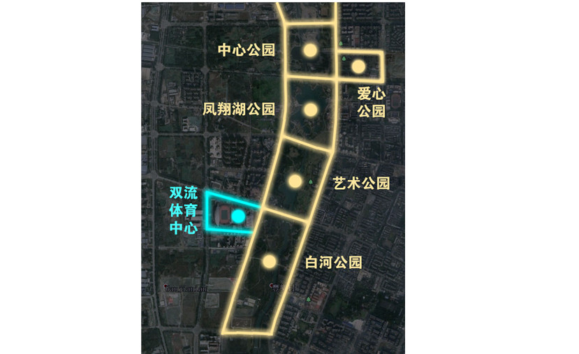 如果將金河路、銀河路兩面擁抱的五個公園比作串在一起的項鏈,那么雙流體育中心則像是鑲嵌在這串項鏈上一顆璀璨的珍珠。