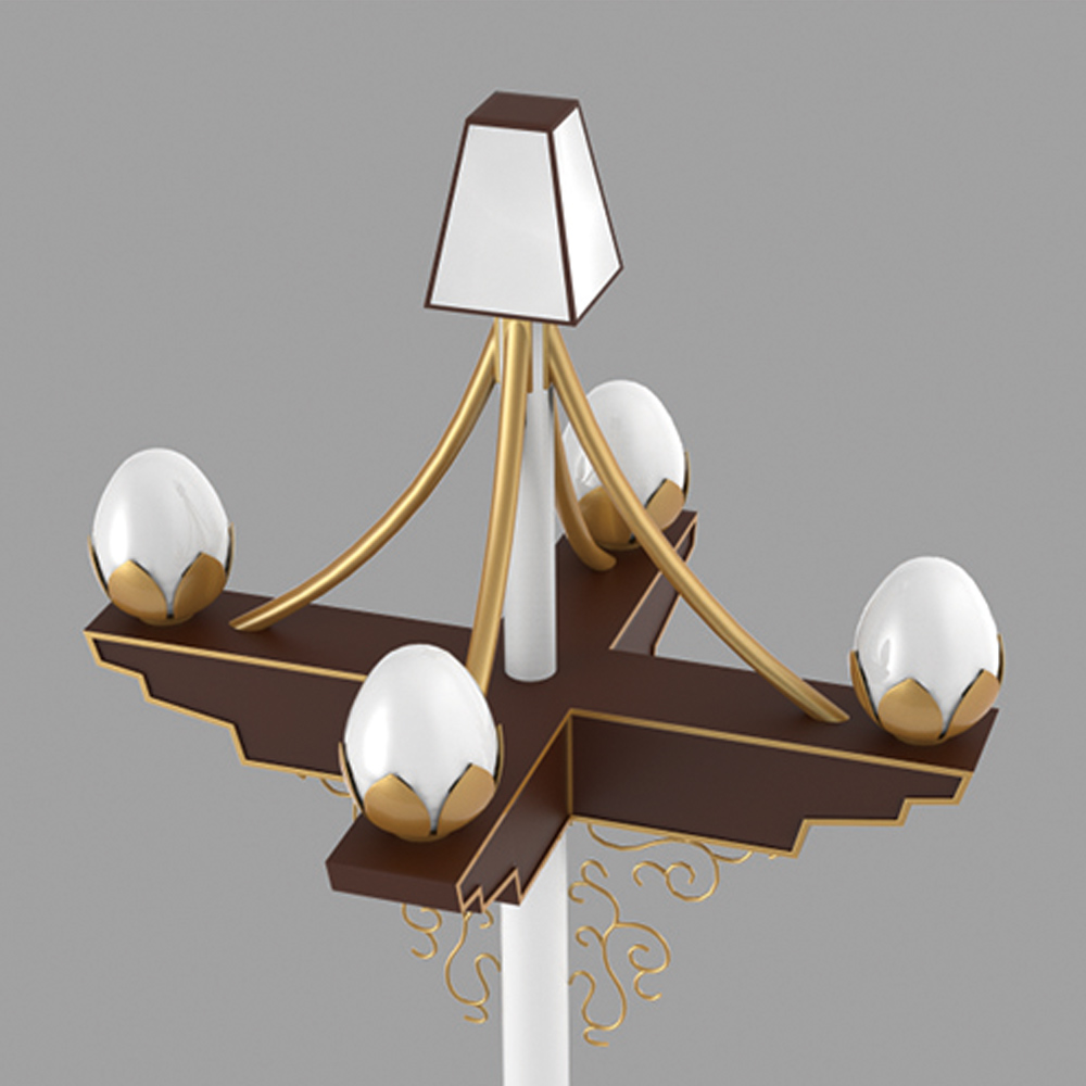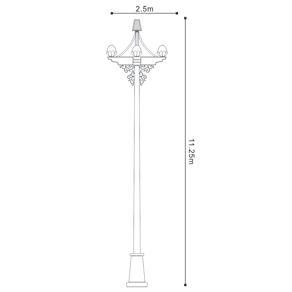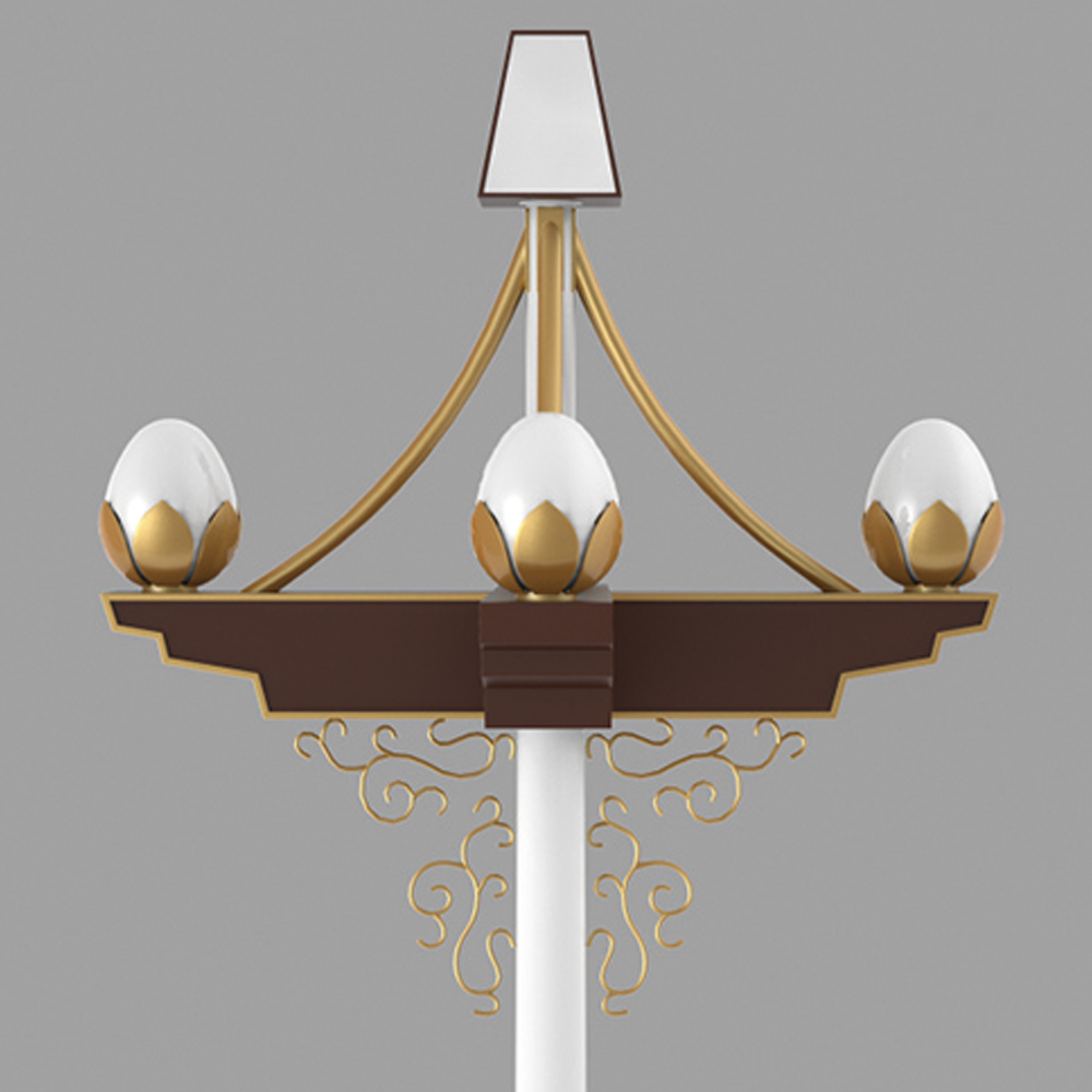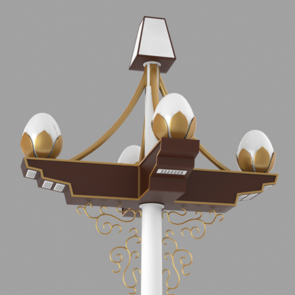 燈罩形似金蓮象征西藏的佛教文化,燈臂象征廟宇,結(jié)構(gòu)整體充滿了西藏獨(dú)有的風(fēng)格,造型突出、結(jié)構(gòu)鮮明、簡潔美觀。